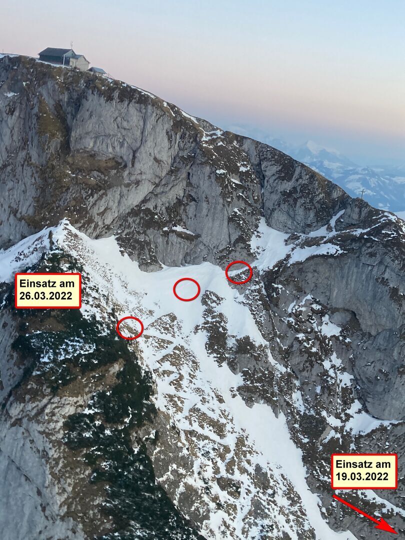 Zu diesem Zeitpunkt schlossen zwei oberösterreichische Wanderer, eine 33-jährige Frau und ein 55-jähriger Mann, die ebenfalls nicht gut ausgerüstet waren, zu der 24-jährigen Deutschen auf. Aufgrund der Steilheit des Geländes und dem eisigen Untergrund war es den drei Wanderern etwa 50 Höhenmeter unter dem Gipfel nicht mehr möglich auf- oder abzusteigen. Sie setzten einen Notruf ab.