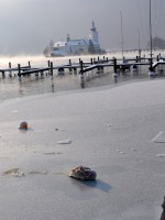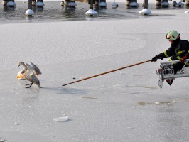 Durch die lang anhaltenden tiefen Temperaturen friert der Traunsee an manchen Stellen bereits zu. So auch im Bereich des Yachtclubs, wo eine Spaziergängerin am 11. Februar 2012 einen am Eis festsitzenden Schwan entdeckte. Sie alarmierte die Gmundner Florianijünger. Bei der Erkundung stellte sich heraus, dass die Eisschicht zu dünn war, um einen Feuerwehrmann zum Schwan zu schicken, auch das Auflegen von Leitern kam nicht in Betracht.