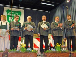 Bezirksobmann – Stellvertreter Josef Leithner überreichte für 50jährige Tätigkeit als aktives Mitglied an Karl Ebner und Franz Zopf das Blasmusik Ehrenzeichen in Gold, an Andi Moser das Blasmusik Ehrenzeichen in Silber für 40-jährige Mitgliedschaft sowie an Christian Zierler und Georg Bruckschlögl die Medaille in Bronze für 15-jähriges aktives Musizieren.