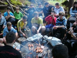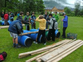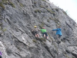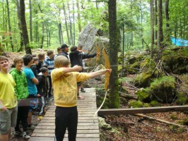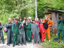 Nach dem Knackergrillen und Bogenschießen gings wieder zurück über den See in die Jugendherberge Obertraun, wo dann noch bis spätabends Fußball gespielt, Trampolin gesprungen und in den Zimmern noch Party gefeiert wurde. Höhepunkt waren sicherlich dann die Klettersteige im Gebiet des Predigstuhles und Hütteneck in Bad Goisern. Mit den professionellen Guides des Teams von outdoor-leadership kletterte man an senkrechten Wänden empor, überquerte 30 m hohe Seilbrücken, überwand Überhänge um sich schließlich über eine 50m Wand abzuseilen und wieder festen Boden unter den Füßen zu haben.