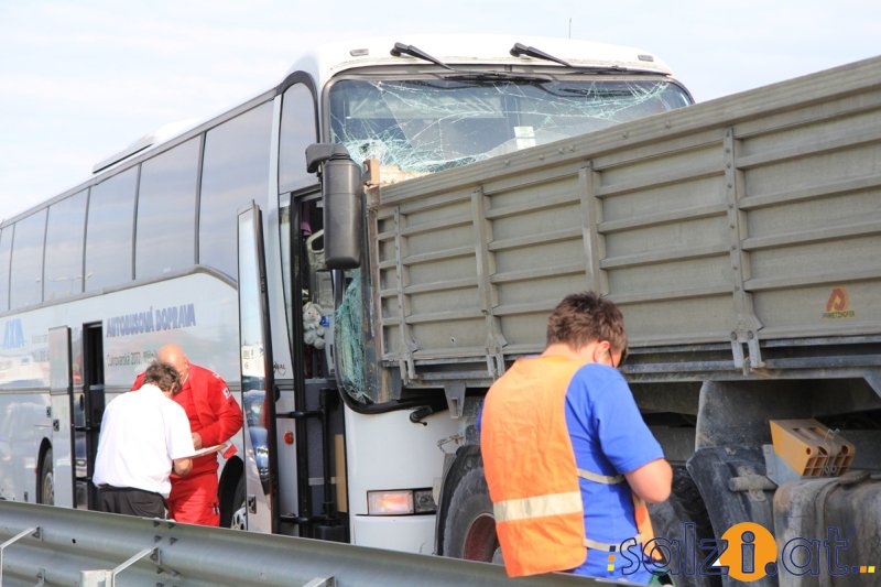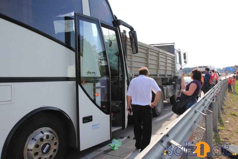 Ein spektakulärer Serienunfall ereignete sich am Freitagnachmittag im Heimreiseverkehr auf der Westautobahn (A1) kurz vor der Autobahnabfahrt Lindach. Eine Wiener Familie hatte dabei gleich mehrere Schutzengel. Ein mit 50 Personen vollbesetzter Reisebus krachte frontal in einen Lastwagen. Die Familie fuhr nach einem Zwischenstopp bei der Raststation Lindach im Baustellenbereich wieder auf die Autobahn auf, wobei der 30-jährige Lenker vor einen in Richtung Salzburg fahrenden LKW auf die Autobahn auffuhr. Der 20-jährige LKW-Fahrer verringerte zuvor seine Geschwindigkeit, um den PKW-Lenker auf den ersten Fahrstreifen auffahren zu lassen.