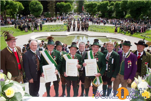 Anschließend wurden die Schützen Josef Buder, Franz Feichtinger sen. und Hubert Schweiger sen, für 25 Jahre Funktionärstätigkeit im Verein mit der Fronleichnamsmedaille geehrt. Mit der Landeshymne, gespielt von allen fünf Ischler Musikkapellen endete der Festakt, dann formierte sich ein imposanter Zug mit 39 Vereinen, der unter klingendem Spiel der heimischen Musikkapellen der Kaltenbachau zustrebte, um auf der Rennbahn noch ein gemeinsames Böllerschießen, eine Salve und Reihenfeuer abzuschießen. In der Festhalle wurde das Jubiläum der Ischler Schützen mit den anderen Vereinen noch entsprechend gefeiert.
