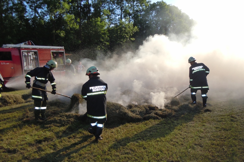 Am Samstagabend wurde gegen 18:30 die Freiwillige Feuerwehr Rüstorf zu einem Heubrand gerufen. Ein in der Rundballenpresse befindliches Heu ist vermutlich durch einen Funkenflug – ausgelöst von einer abgerissenen Kette – in Brand geraten.