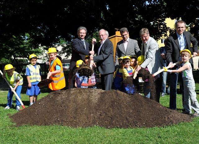 vlnr: Bgm. Peter Groiß, LH-Stv. Josef Ackerl, LAbg. Hermann Krenn, Dr. Karl Leitner (Fa. Doubrava), Architekt Peter Gilhofer und im Vordergrund helfende Kindergartenkinder
