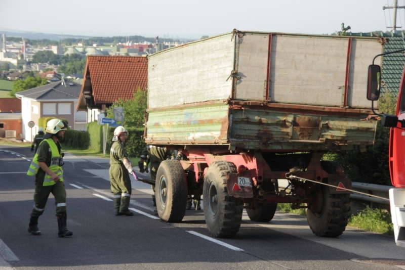 Der Gemeinde LKW übernahm das Ausladen der Ladung am Anhänger. Dieser wurde im Anschluss zu einer nahegelegenen Bushaltestelle geschleppt, damit der Besitzer eine Ersatzdeichsel montieren konnte und der Verkehr frei gegeben werden konnte. Der Traktor wurde vom Besitzer abgeschleppt. Nach rund 1,5 Stunden in der heißen Sommersonne konnte der Einsatz beendet werden und die Sperre der Landesstraße aufgehoben.