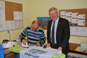 „Es ist beeindruckend, was hier von und mit Menschen mit Beeinträchtigung geleistet wird“, zeigte der Landtagspräsident großes Interesse an den verschiedenen Produktionsbereichen. In der Wäschereiabteilung griff er beispielsweise selbst zum Bügeleisen, um ganz in den Arbeitsalltag der Tagesheimstätte einzutauchen. Sehr angetan von der hohen Qualität und dem vielfältigen Angebot gab er der Tischlerei den Auftrag für mehrere Nisthotels beziehungsweise Vogelhäuser.
