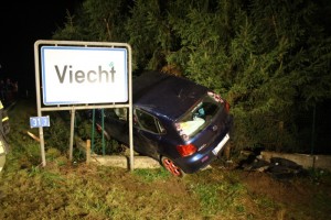 In der Nacht auf 27. Oktober um ca. 03.18 Uhr wurde die Feuerwehr Windern zu einem Verkehrsunfall in der Ortschaft Viecht, Gemeinde Desselbrunn, OÖ alarmiert. Eine Lenkerin ist auf der B135 von der Ortschaft Windern kommend von der Straße abgekommen und in weiterer Folge in eine Gartenmauer gekracht. Das Auto war zwischen der Ortstafel Viecht und zwischen Bäumen einklemmt.