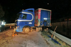 In der Nacht auf Donnerstag wurde gegen 3:30 Uhr die Freiwillige Feuerwehr Frankenmarkt zu einem LKW-Unfall mit Dieselaustritt an der B1 Nähe Kläranlage gerufen. Aufgrund von Glätte auf der Trenaubrücke knickte ein Sattelzug ein und riss sich mit der Auflegerstütze einen der Dieseltanks an der untersten Stelle auf. Aufgrund der Größe des Lecks und da der LKW vollgetankt war, waren beim Eintreffen der Feuerwehr bereits mehr als 500l Diesel ausgetreten.
