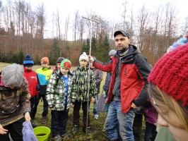 Um dies zu erkunden, begaben sich die Kinder der 2. Klassen in die Moore des Ortsteiles Gschwandt. Herr Kirchschlager erlaubte eine Bohrung auf seinem Grund und das 5-köpfige Wissenschaftler-Team erklärte seine Vermutungen: In diesem Moor könnten sich in seinen tieferen Schichten Pollen befinden, die belegen, dass in der Hallstattzeit oder in der Bronzezeit (ca. 1600-1200 v. Chr.) hier bereits Tiere geweidet haben oder Getreide angebaut wurde.