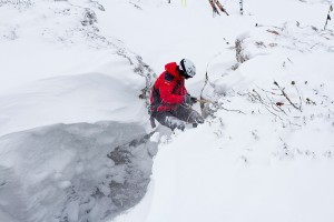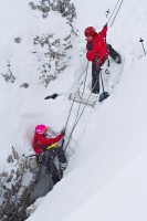 Da es dann auch noch vorkommt, dass Wintersportler entweder alleine unterwegs sind, oder die Gruppe nicht mehr genau weiß, wo sie zuletzt beisammen war, gilt es oftmals zahlreiche Dolinen abzusuchen. Hierfür wurde die sogenannte Einseiltechnik geübt. Eine Einsatzgruppe fährt die infrage kommenden Dolinen ab und zwei Mann seilen sich – ausgerüstet mit „Pieps“, Recco-Suchgerät, Schaufel und Sonde – in diese ab. Wurde die Doline abgesucht, steigen sie am selben Seil selbstständig wieder auf.