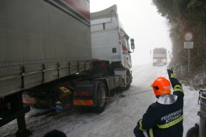 Am Mittwochmorgen wurde die Feuerwehr Attnang zu einer LKW-Bergung in die Steinhüblstraße gerufen. Nach einem missglückten Wendemanöver auf dem Radweg rutschte ein Sattelschlepper von der Straße ins angrenzende Feld.