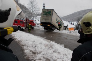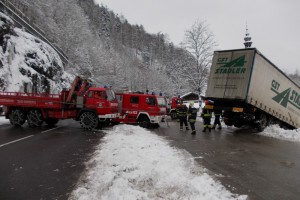 Der Lenker eines Sattelzuges fuhr mit seinem Fahrzeug in Richtung Bad Ischl und kam aus noch unbekannter Ursache von der Fahrbahn ab und rutschte über eine Böschung, wo ein Fichtenbaum den Überschlag des Sattelzuges verhinderte. Da die Gerätschaften der Einsatzkräfte der Freiwilligen Feuerwehren Lauffen und Bad Ischl nicht ausreichen, wurde das Kranfahrzeug der FF Vöcklabruck zur Bergung nachalarmiert.