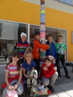 Die Kinder der 3a Volksschule Schwanenstadt haben in der Kirchengasse in Schwanenstadt drei Laternen bunt umhäkelt – „WOLLFÜHLEN“ – eine Aktion des Tourismusverbandes Schwanenstadt im Jahr des FÜHLENS.