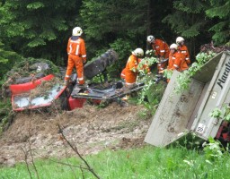 Schwieriger Bergungseinsatz für die FF Bad Goisern am 3. Juni 2013, ein Hangrutsch hatte einen Traktor samt Anhänger mit sich gerissen. Die Bergung aus dem steilen Gelände konnte nur mit schwerem Gerät erfolgen.