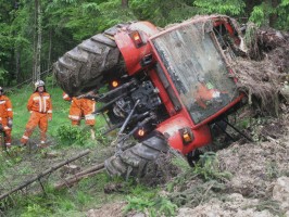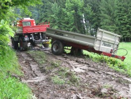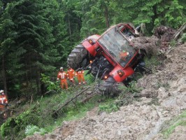 Das in einem Unterstand abgestellte Traktorgespann war von einem Erdrutsch mitgerissen worden, der sich aufgrund der starken Regenfälle oberhalb gelöst hatte. Teils unter den Schlammmassen begraben war der umgestürzte Traktor samt Hänger im steilen Gelände zum Stillstand gekommen.