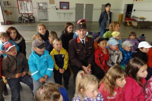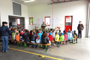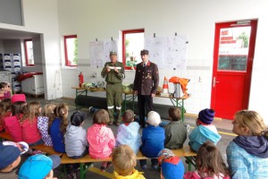 Zu Beginn stellte sich der neue Feuerwehrkommandant HBI Markus Forstinger den Kindern vor, anschließend erklärte OLM Karl Schoissengeyer die Aufgaben der Feuerwehr wie Brandschutz und -bekämpfung, die Arbeit bei der Feuerwehr, Ausbildung (auch Feuerwehrleute müssen hin und wieder in die Schule…), was passiert wenn man die Sirene hört, wie sich ein Feuerwehrmann richtig anziehen muss, und vieles mehr.