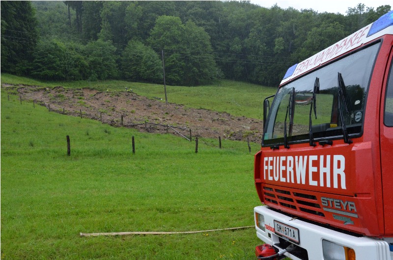 Sieben Stück Vieh, die sich dort auf der Weide befanden, mussten in Sicherheit gebracht werden. Die Feuerwehr und ein Baggerunternehmen führten die Aufräumungsarbeiten durch.