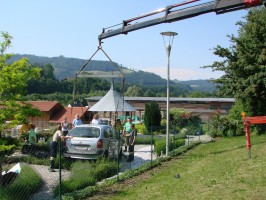 Ein Richtung Pettenbach fahrender PKW-Lenker durchstieß aus unbekannter Ursache eine Firmenumzäunung und landete in der Ausstellungsfläche eines Natursteinunternehmens. Für die Bergung des verunfallten Fahrzeuges wurde ein Abschleppunternehmen beauftragt, da die Bergung nur mittels Kran möglich war.