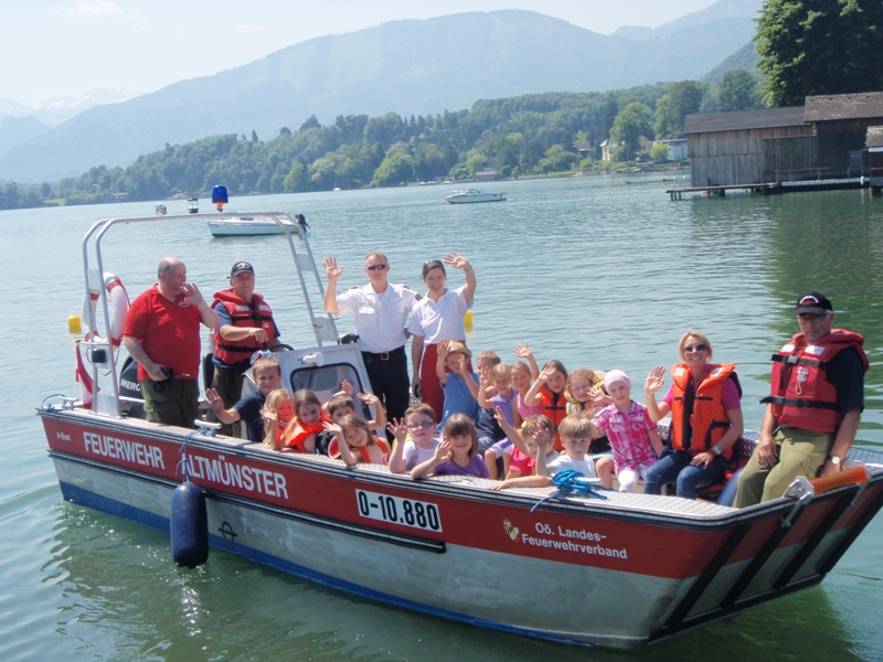 Beamte der Bundespolizei Gmunden informierten über ihre Aufgaben. Wahrlich ein spannender Höhepunkt war das Anprobieren der schweren Schutzweste. Eine kühle Stärkung rundete das Programm beim Roten Kreuz ab. Ein abschließendes Highlight war die Feuerwehrvorführung auf der Esplanade in Altmünster. Die Feuerwehr Altmünster präsentierte ihr Tanklöschfahrzeug, wo bei den verschiedenen Stationen die Aufgaben und Gerätschaften erklärt wurden. Dabei durfte das Selbsthandanlagen natürlich nicht zu kurz kommen.