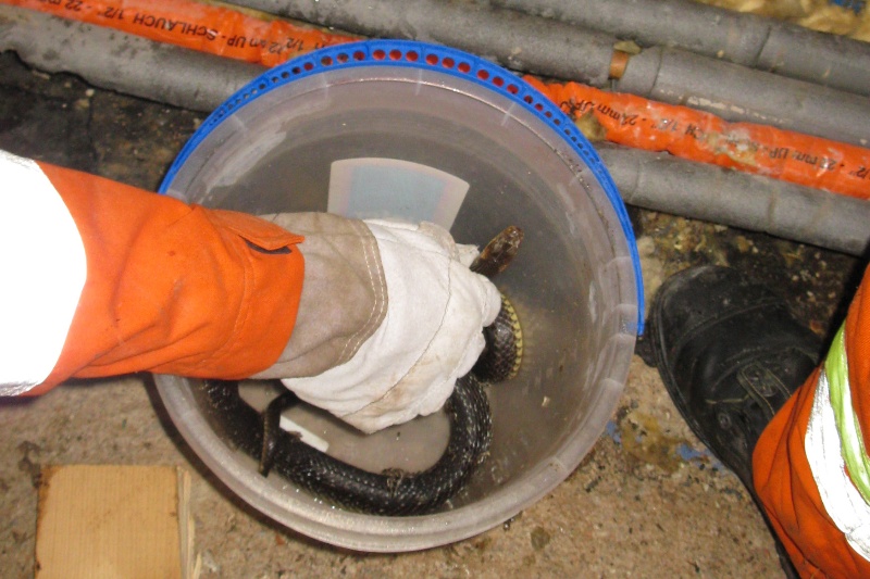 Ein weiterer Zwischenboden musste noch geöffnet werden, um die Natter versteckt zwischen Heizungsrohren zu sichten. Auch wenn sich die Schlange gehörig zur Wehr setzte, gelang es den Florianijüngern dann doch, sie in einen Kübel einzufangen. Nahe dem Traunfluß wurde der ungebetene Wohnhausgast dann wieder in seine natürliche Umgebung entlassen.