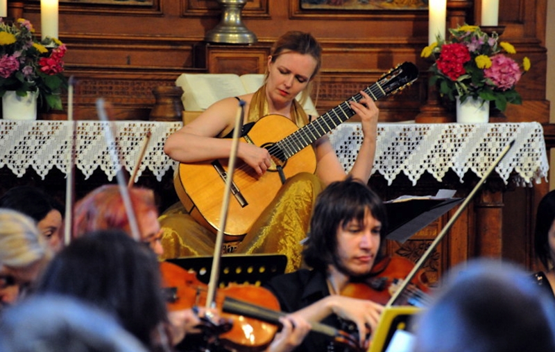 Im ersten Teil gab die Sinfonietta da Camera unter ihrem langjährigen Leiter Peter WesenAuer das berühmte Gitarrenkonzert von Joaquin Rodrigo, Solistin war Heike Matthiesen aus Deutschland. Ein Raunen ging durch die Menge, als die ersten Takte des zweiten Satzes erklangen und viele eine Melodie wiedererkannten, die sie zuvor nicht zuordnen konnten. Als dann das Orchester mächtig anschwoll, fühlte man sich wie in Spanien – die Hitze lag förmlich in der Luft. Heike Matthiesen bedankte sich für den großzügigen Applaus mit Francisco Tárregas „Recuerdos de la Alhambra“ als Zugabe.
