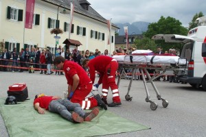 Am 29. Juni wurde obiges Jubiläum am Marktplatz Bad Goisern gebührend gefeiert. Das Programm konnte sich sehen lassen. Eingangs fand eine Vorführung der Dirtbike – Sektion der ASKÖ Bad Goisern statt. Die mutigen Sportler erhielten viel Applaus. Bei der anschließenden Schauübung nahm man an, dass sich ein Dirtbiker verletzt hatte und sich eine Wirbelsäulenverletzung zuzog. Zuerst leistete ein Ersthelfer erste Hilfe. Dann wurde der Verletzte von zwei Sanitätern der Ortsstelle Bad Goisern fachgerecht unter Anwendung der „Traumadrillinge“ versorgt.