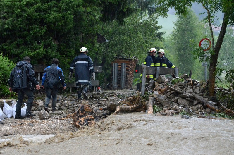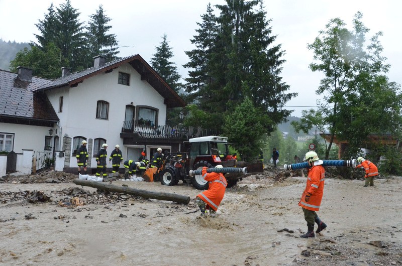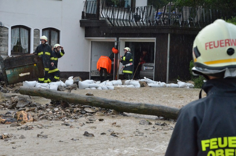 „Nach kurzer Lagebesprechung im Feuerwehrhaus Oberwang wurden wir zum Sägewerk Schindlauer beordert, dort war das Haus im Erdgeschoß einen halben  Meter unter Wasser. Auch die umliegenden Gebäude, Hauser und Garagen waren überflutet. Die Zufahrtsstraße wurde weggerissen und wir mussten die gesamten Gerätschaften mit Traktoren zu den Häusern bringen. Mit Baggern wurde beim Bach ein Damm errichtet und eine provisorische Straße errichtet. Danach konnten wir mit den Fahrzeugen zu den Häusern vorrücken und mit dem Aufräumen beginnen.“, berichtet die Freiwillige Feuerwehr St. Georgen i. A!