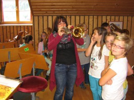 Anschließend versuchten die Kinder allerlei Holz- und Blechblasinstrumente sowie das Schlagzeug am hören zu erkennen, was meistens auch gelang. Die Instrumente wurden kurz vorgestellt, nach und nach durften die Kinder alle Musikinstrumente durchprobieren. Zu unserer großen Freude funktioniert das „Töne erzeugen“ bei den meisten Kinder bravourös und auch die eine oder andere Lehrkraft versuchte ihr Glück.