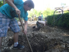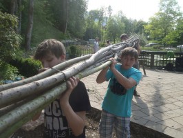 Mit besserwerdendem Wetter konnte in der ersten Maiwoche mit dem tatsächlichen Bauen begonnen werden. Seitens des Seniorenheimes wurde der Untergrund vorbereitet, sodass sich die Weidenlaube schön in die landschaftlichen Gegebenheiten des Gartens fügt. Entsprechend der Planung die elf Weidenbögen vorsah, galt es zweiundzwanzig Weidenbündel mit einer Stärke von 30-40cm zu schnüren, sechs Löcher mit einer Tiefe von einem Meter und einem Durchmesser von bis zu 60cm zu graben und schlussendlich die Bögen in die gewünschte Form zu bringen.