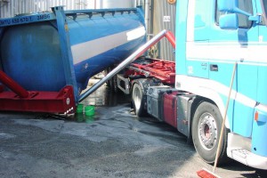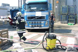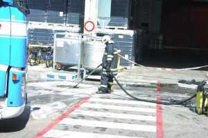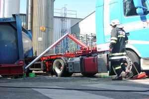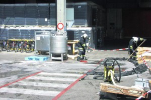 In der Erstphase wurde vom Betriebspersonal hervorragende Arbeit geleistet. Kanalschächte wurden abgedeckt und Ölsperren aufgelegt. In Zusammenarbeit mit der Feuerwehr Puchheim wurde das ausgelaufene Hydrauliköl mit mehreren Säcken Bindemittel gebunden und anschließend beseitigt. Parallel dazu wurde mit dem hydraulischen Rettungsgerät vom Rüstlöschfahrzeug die Hydraulikanlage zwischen Aufleger und Container getrennt.