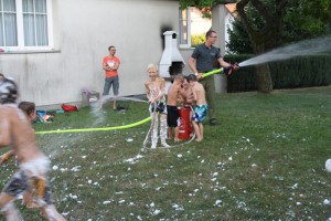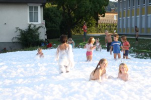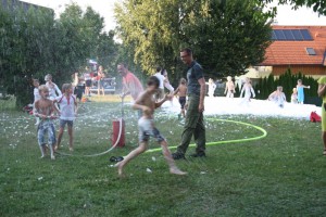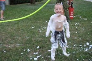 Nach ca. 30 Minuten ging es dann mit den drei Feuerwehrfahrzeugen zur Hauptschule, wo wir auf der Schulwiese zu den praktischen Aufgaben kamen. Es wurde der berühmte „Schaumteppich“ aufgebracht, wo sich die Kinder sichtlich wohlfühlten. Aber nicht nur der Schaum war beeindruckend, sämtliche Wasserführende Armaturen wie z.B. Hydroschild, Löschleitung mit C-Strahlrohr und die Kübelspritze wurden ausgepackt und ausprobiert. Abschließend gab es noch eine spektakuläre Vorführung über die Auswirkung eines Fettbrandes bei dem Versuch diesen mit Wasser löschen zu wollen. Das Ergebnis war eine mehrere Meter hohe Stichflamme.