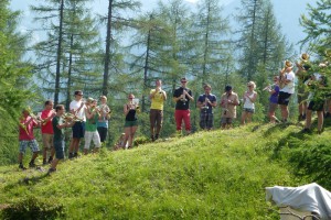 Auch heuer leisteten 19 Musiker der Bürgerkorpskapelle mit ihrem Spiel einen besonderen Beitrag zur großen Feierlichkeit dieser Bergmesse. Die Teilnehmer, zwischen den roten Blüten des Almrausch sitzend, waren von diesem einmaligen Erlebnis wider sehr bewegt und feierlich gestimmt.