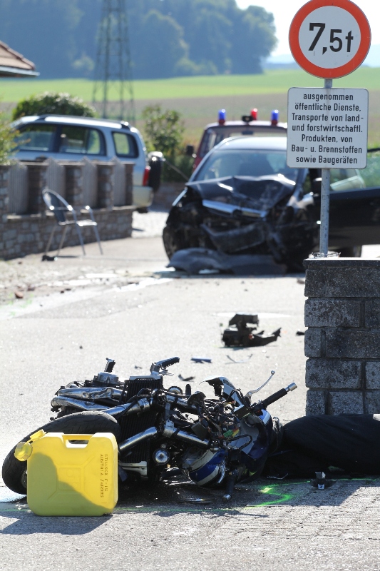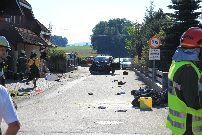 Ein schrecklicher Motorradunfall ereignete sich am Mittwochnachmittag auf der Gamperner Landesstraße L1274 zwischen Steindorf und Gampern (Bezirk Vöcklabruck). Im Kreuzungsbereich Viehaus-Genstetten kollidierte aus noch unbekannter Ursache ein 39-jähriger deutscher Biker mit einem Auto frontal. Warum und wie es zu dem Unfall kam, ist noch Gegenstand der Ermittlungen. Durch die Wucht des Zusammenstoßes wurde das Auto der 34-jährigen Frau aus St. Georgen gegen die Hausfassade eines im Kreuzungsbereich befindlichen Hauses geschleudert. Der Eingangsbereich des Einfamilienhauses wurde dabei schwer beschädigt.