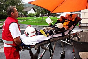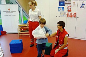 Auch das Anlegen von Verbänden sowie das Ausprobieren des Rettungsmaterials im Sanitätseinsatzwagen machten den Kleinen sichtlich viel Freude – trotz des Regens waren alle mit vollem Engagement dabei. „Solche Besuche Sind auch für uns wichtig, um Kindern schon in jungen Jahren den Stellenwert der Ersten Hilfe und vor allem des sozialen Miteinander zu zeigen und gleichzeitig die Scheu vor einem möglichen Einsatz zu nehmen“, erklärt Rot-Kreuz-Dienstführender Bernd Offenberger.