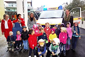Ein Besuch durch das Rote Kreuz im Kindergarten der Franziskanerinnen in Mondsee bleibt den Kindern wohl noch lange in Erinnerung. Fünf Sanitäter zeigten den rund 100 Buben und Mädchen sowie ihren Betreuerinnen, wie der Alltag eines Rettungssanitäters so abläuft.