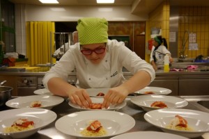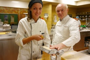 Aber auch für Küchenmeister Günther Gaderbauer, der Kreative Küche schon zum neunten Mal leitet, ist dieser Kurs eine willkommene Abwechslung. „Die Grundtechniken beherrschen die Schülerinnen natürlich schon, aber hier geht es ums Perfektionieren“. Nicht nur exklusive Speisen wie eben Hummer oder Tauben sind ihm ein Anliegen, sondern auch beinahe in Vergessenheit geratene Hausmannskost, wie Beuschel oder Kutteln.