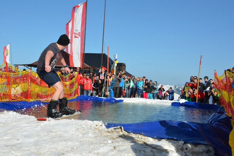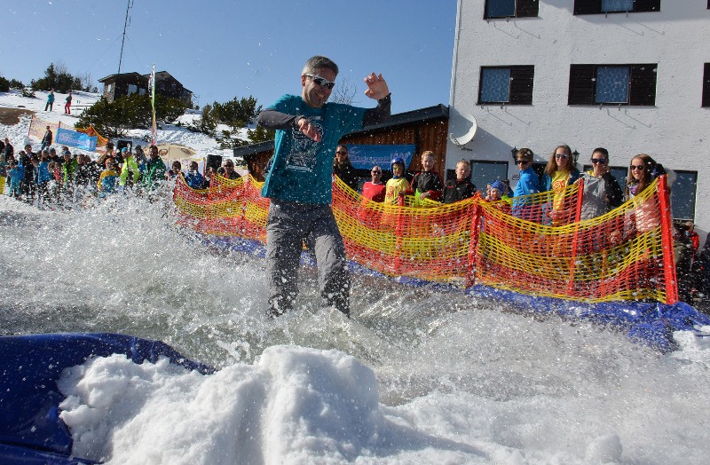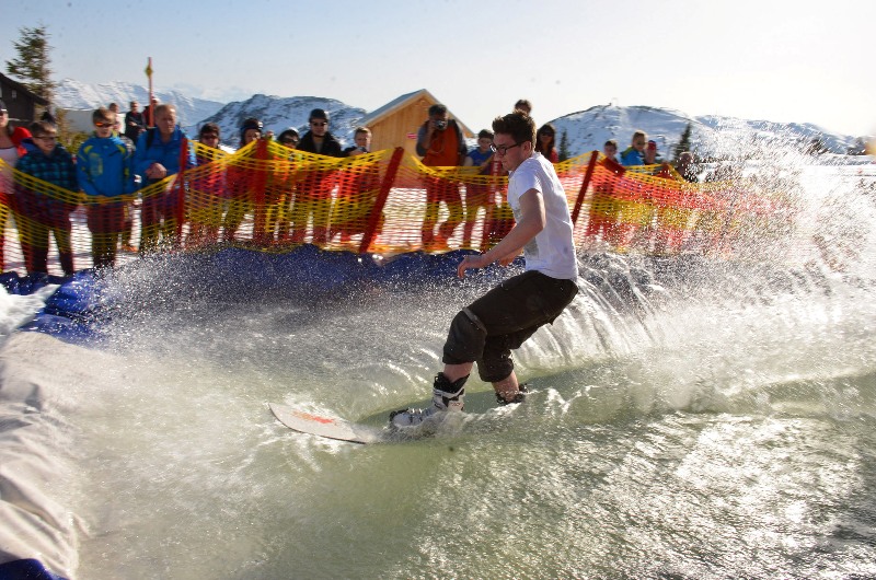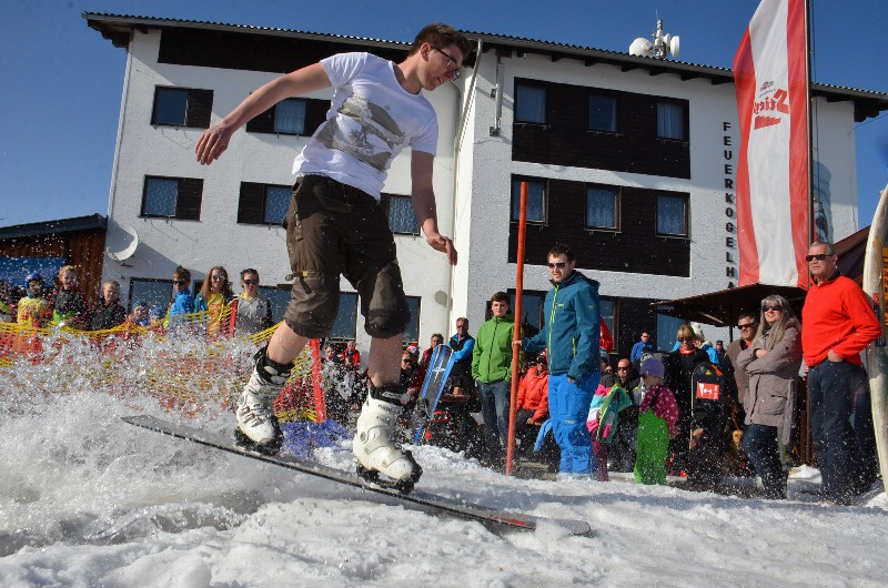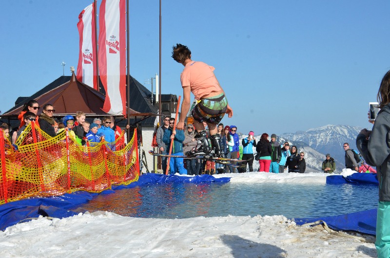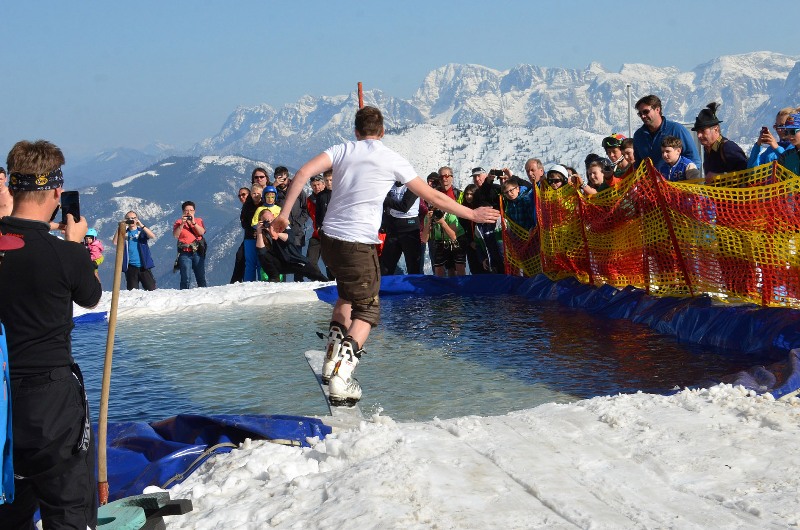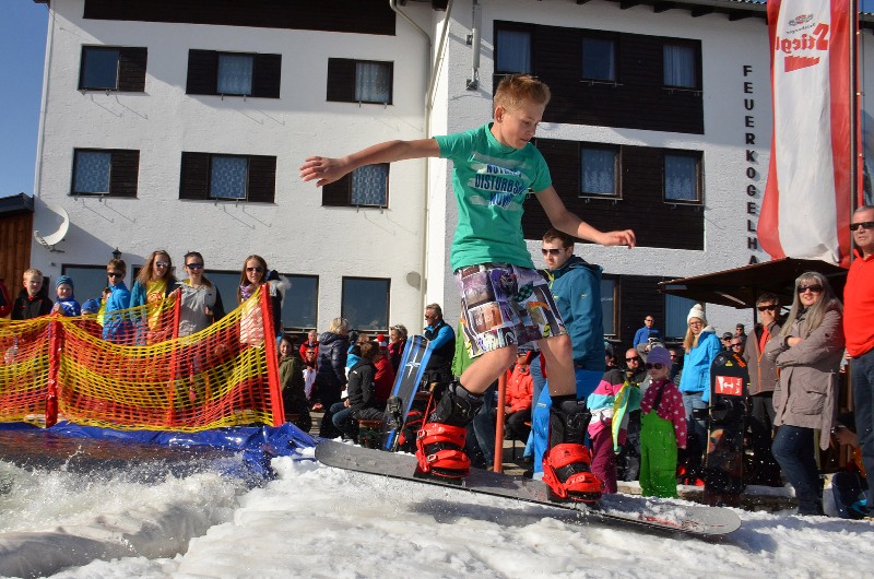 Akrobatischer und nasser Saisonabschluss am Samstag am Feuerkogel: Beim Watersplash im Rahmen des Saukopfspringens blieb keiner trocken. Die Teilnehmer mussten mit Snowboard oder Ski über ein acht Meter langes Wasserbecken fahren – oder besser gesagt balancieren. Im KO-Verfahren wurde der Anlauf bei jedem Durchgang um ein paar Meter verkürzt – so lange, bis nur noch der Beste über das Becken kam.