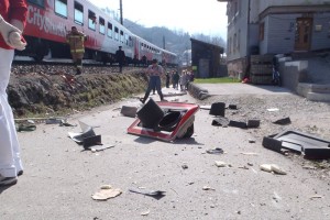 Der Mann verließ deshalb das Führerhaus, um den Lokführer des aus Bad Ischl kommenden Zugs durch Handzeichen auf seine missliche Lage aufmerksam zu machen. Der 49-jährige Lokführer konnte aufgrund der gefahrenen Geschwindigkeit von 70 km/h und des nur noch rund 100m entfernten schräg über dem Bahnübergang manövrierunfähigen LKW nur noch eine Schnellbremsung einleiten. Der Steuerwagen der Zuggarnitur erfasste den rechten hinteren Bereich des Sattelzuganhängers, wodurch dieser vom Gleisbereich geschoben wurde. Die Zuggarnitur blieb rund 200 Meter nach dem Aufprall mit dem Sattelzug stehen.