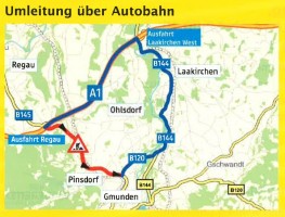 Dabei wird die Fahrtrichtung Gmunden von Vöcklabruck kommend für den Verkehr zur Gänze gesperrt. Lediglich von Gmunden aus kommend wird man in Richtung Vöcklabruck fahren können. Eine großräumige Umleitung über Vöcklabruck, Schwanenstadt, Steyrermühl bis nach Gmunden wird eingerichtet. Aber auch die Fahrtrichtung Vöcklabruck ist über die Westautobahn (A1) Anschlußstelle Laakirchen West gut erreichbar.
