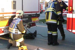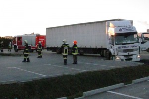 Vorerst sicherte die Feuerwehr die Unfallstelle ab und baute den Brandschutz auf. Da die Einsatzleitung feststellte, dass keine Treibstoffe freigesetzt wurden, konnte man sofort mit den Bergemaßnahmen beginnen. Mit pneumatischen Hebekissen und der Einbauseilwinde des Rüstlöschfahrzeuges wurde der Sattelschlepper vorsichtig aus seiner misslichen Lage befreit. Nach geraumer Zeit wurde das Fahrzeug wieder sicher auf die Fahrbahn gestellt.