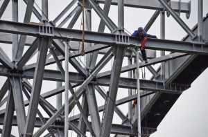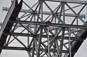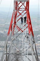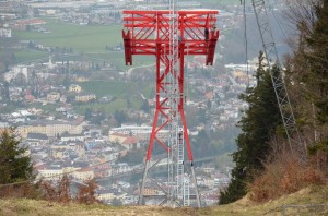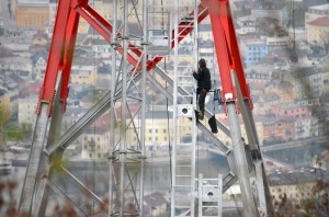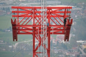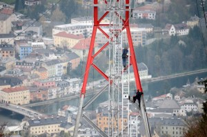 Keine Höhenangst dürfen die Arbeiter haben, die derzeit die Stützen der neuen Grünberg-Seilbahn montieren. Die „Kletter-Maxen“ verschrauben in rund 30 Metern Höhe die kolossalen Stahlgerüste. Als kleinen Ausgleich für die anstrengende und herausfordernde Arbeit gibts einen traumhaften Ausblick auf den etwa 350 Meter darunter liegenden Traunsee und die Stadt Gmunden.