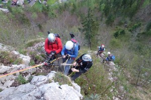 Als sie um 17:20 Uhr einen kurzen, aber schwierigen Steilaufschwung erreichten, konnten sie diesen aufgrund Erschöpfung nicht mehr bewältigen. Ein Abstieg erschien den beiden ebenfalls zu schwierig, weshalb sie über Alpinnotruf 140 die Bergrettung alarmierten. Ein Alpinpolizist und 14 Bergretter stiegen zu den Erschöpften auf. Sie sicherten die beiden und begleiteten sie zu einem geeigneten Platz in der Wand.