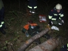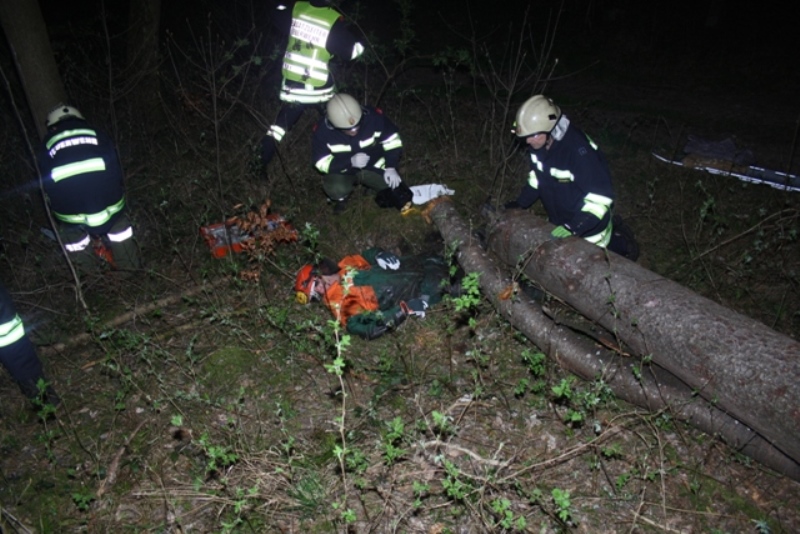 Der Forstarbeiter wurde unter einem Baum eingeklemmt und zog sich eine Pfählungsverletztung im Unterschenkel zu. Die FF Rüstorf konnte mit deren kleinen geländegängigen Fahrzeug zum Verletzten vordringen und die nötigen Gerätschaften (Notstromaggregat, elektrische Säge, Hebekissen,…) zum Unfallort mitnehmen.