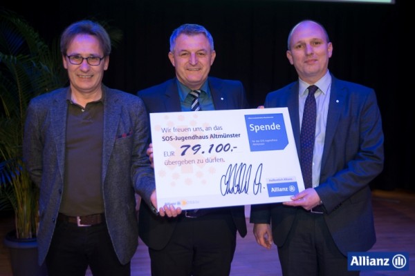 Mario Mukenschnabel, Leiter der Allianz Landesdirektion in Oberösterreich, übergab einen Scheck über 79.100 Euro. Die Bitte um Unterstützung ging an sämtliche Außendienstmitarbeiter, Sachbearbeiter, Pensionisten sowie Agenturpartner der Allianz Oberösterreich. „Die Spendenbereitschaft meiner Mitarbeiterinnen und Mitarbeiter sowie Agenturpartner und Pensionisten war überwältigend“, sagt Mukenschnabel. „Die Allianz Oberösterreich steht zu ihrer gesellschaftlichen Verantwortung – damit haben wir eine große Gemeinsamkeit mit der Idee von SOS-Kinderdorf“.