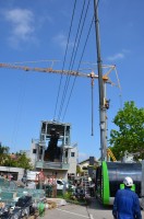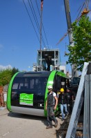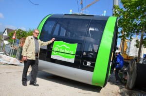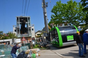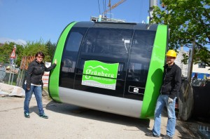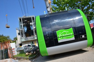 Viele Interessierte zog heute die Anlieferung und Montage der ersten Gondel der neuen Grünberg-Seilbahn in Gmunden an. Und einige nutzten die Gelegenheit, die Gondel sogar hautnah zu inspizieren. Die Gondel wird heute im Laufe des Tages mit einem großen Kran auf das Tragseil gehoben.