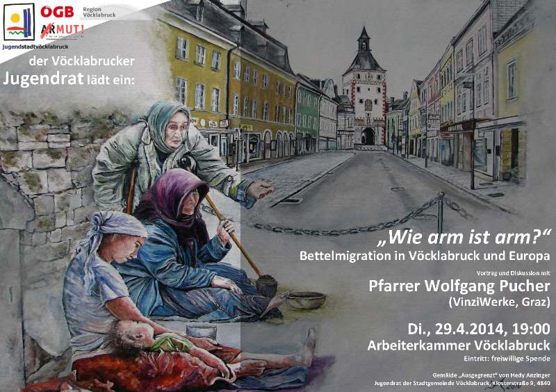 Der Grazer Pfarrer Wolfgang Pucher wird wegen seines sozialen Engagements in den Medien oft auch als „Grazer Armenpfarrer“ bezeichnet. Viele Sozialprojekte tragen seine Handschrift wie z. B. VinziBett (Nachtschlafstelle), VinziHelp (rechtliche und finanzielle Unterstützung für Frauen), VinziTel (Obdachlosenhotel zur Überbrückung von kurz- bis mittelfristige lösbare Wohnprobleme), VinziMed (Krankenstube mit ärztlicher Betreuung) um nur einige Projekte zu nennen. Sein Wissen, seine Erfahrungen und seine Sichtweisen machen den „Grazer Armenpfarrer“ Wolfgang Pucher zum Experten beim Thema „Wie arm ist arm“. Der Jugendrat Arbeitskreis „Bettler“ der Stadt Vöcklabruck, bestehend aus Sr. Ida Vorel (Jugendrat), Sarah Lothring (Jugendrat), Martin Schachreiter (Volkshilfe), Maria Eicher (Caritas), Bob Bach (HTL), Alois Schrattenecker (Stadtrat), in Zusammenarbeit mit dem Armutsnetzwerk und dem ÖGB Vöcklabruck freuen sich auf zahlreiche Teilnahme bei der Veranstaltung in der Arbeiterkammer.