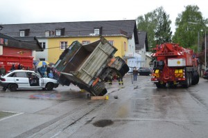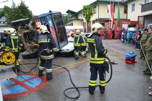 Um 13 Uhr zeigten die Höhenrettungsstützpunkte Vöcklabruck und Frankenmarkt ihr Können – mehrere Übungsannahmen wurden abgearbeitet. Am Ende der Veranstaltung um 15 Uhr stand eine technische Einsatzübung – LKW auf PKW – am Programm. Zuerst musste mittels hydraulischen Rettungsgeräts eine Person gerettet werden, danach wurde mittels Kran und WLF der LKW geborgen.