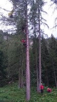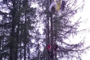 Einem Helfer gelang es mit Baumsteigeisen die Lärche hochzusteigen und den Verunfallten abzuseilen. Der 29-Jährige klagte lediglich über leichte Schmerzen im Bereich der Rippen. Er gab an, dass er vom Sturm überrascht wurde. Weil er nicht an Höhe verlor, flog er in Richtung Schönbergalm, wo er allerdings in Richtung der dortigen Wandabbrüche gedrängt wurde und chancenlos gegen den Baum flog. An eine kontrollierte Landung war unter diesen Verhältnissen nicht zu denken.