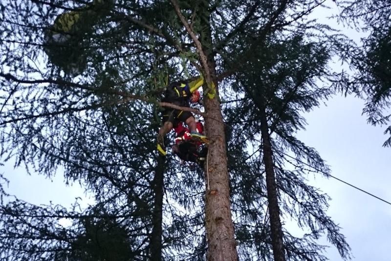 Einem Helfer gelang es mit Baumsteigeisen die Lärche hochzusteigen und den Verunfallten abzuseilen. Der 29-Jährige klagte lediglich über leichte Schmerzen im Bereich der Rippen. Er gab an, dass er vom Sturm überrascht wurde. Weil er nicht an Höhe verlor, flog er in Richtung Schönbergalm, wo er allerdings in Richtung der dortigen Wandabbrüche gedrängt wurde und chancenlos gegen den Baum flog. An eine kontrollierte Landung war unter diesen Verhältnissen nicht zu denken.
