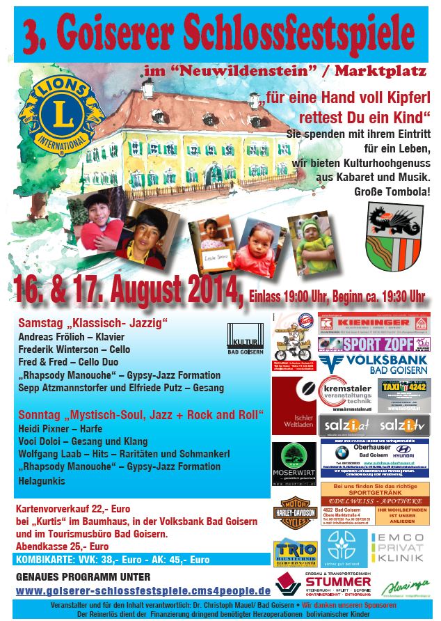 Die bekannte Südtirolerin Heidi Pixner spielt auf ihrer Harfe und verzaubert uns mit ihren virtuosen Klängen und Poesie. Mitglieder des Goiserer Kabarett – Ensembles erlauben sich, ebenso wie bekannte Goiserer -Musik – Ikonen, unter ihnen auch Altmeister Sepp Atzmanstorfer, der Unterhaltung beizuwohnen. Mit ihrer Hilfe wollen wir wieder Kindern ein annährend normales Leben ermöglichen. 2012 waren es 2 Kinder, 2013 drei, 2014 sind es dank ihrer Hilfe vielleicht schon vier oder mehr …